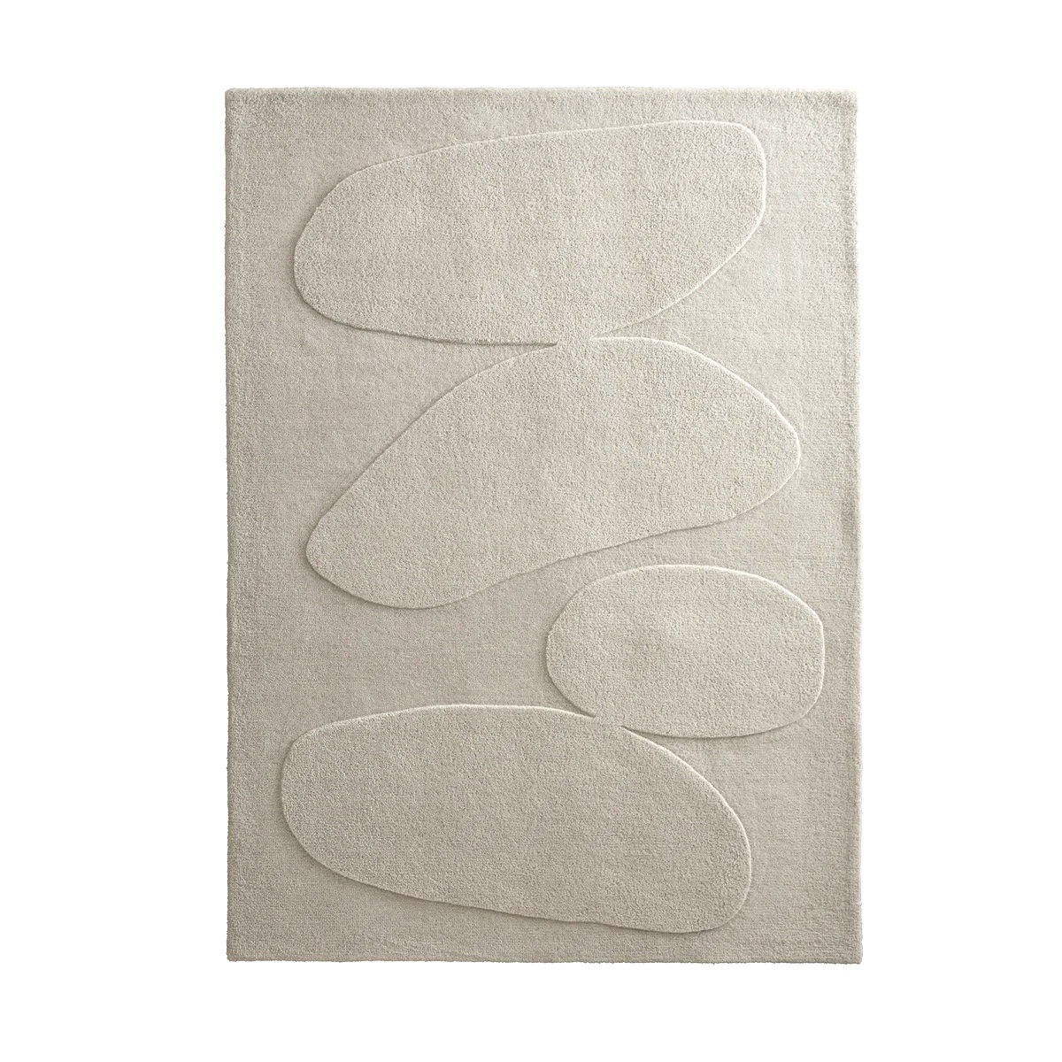 Grand tapis sculpté beige façon galets, 100 % laine, moderniste et scandinave, formats différents comme le 200 × 290 cm, rectangulaire et haut de gamme.