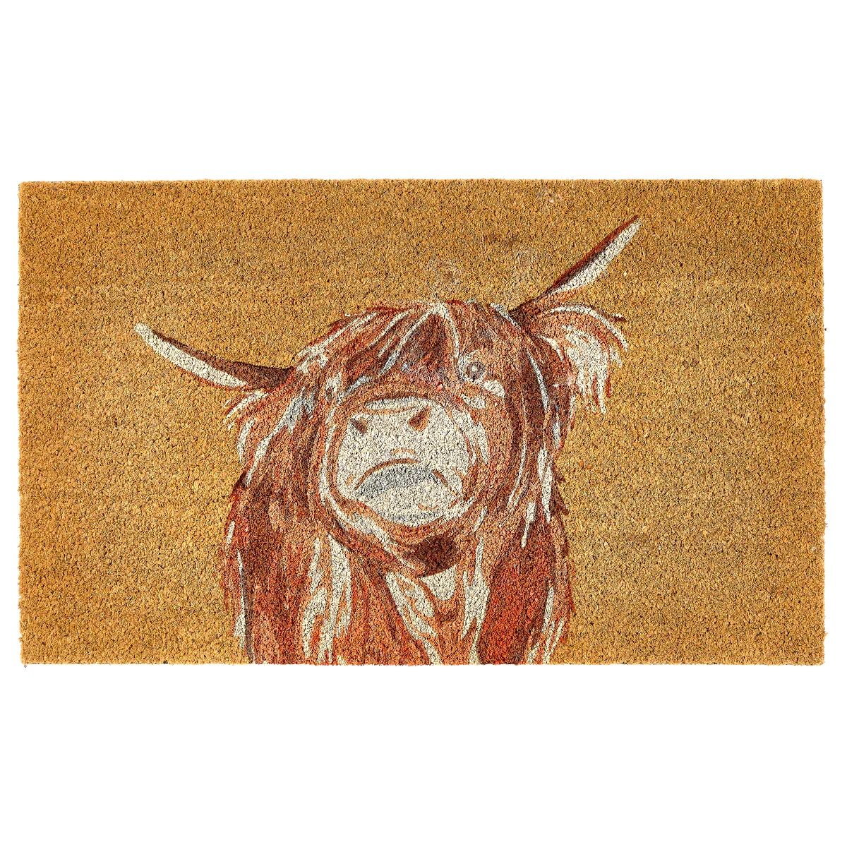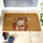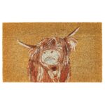 Tapis coco « Tête de Vache Écossaise » 45×75 cm. Résistant à la pluie fine, antidérapant, rustique et écoresponsable. Idéal entrée abritée.