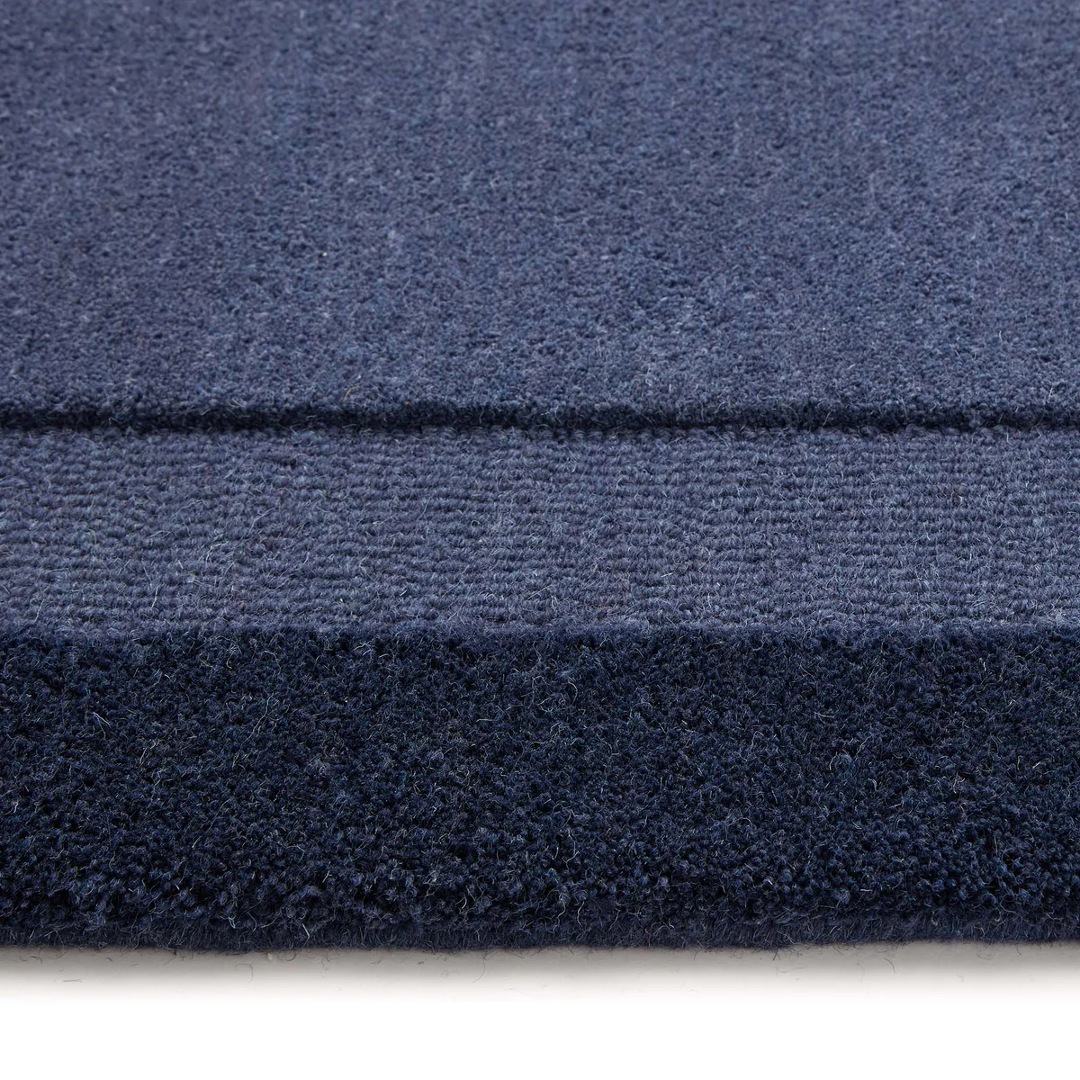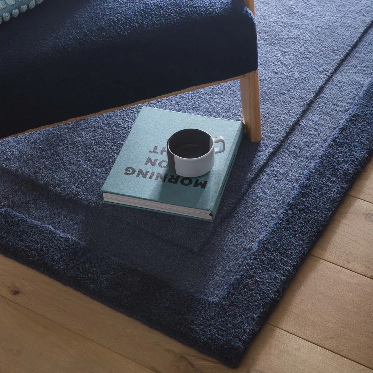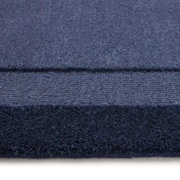 Tapis bleu moderniste à bordure sculptée — pure laine tuftée main et raffinement contemporain
