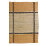 La teinte paille-or, oscillant entre beige chaud et jaune doré, donne instantanément une impression de lumière douce. Les lignes graphiques, sobres et régulières, introduisent un rythme subtil sans perturber la sérénité de la pièce. Le tapis devient un véritable socle décoratif, autour duquel le mobilier et les objets prennent place avec évidence.