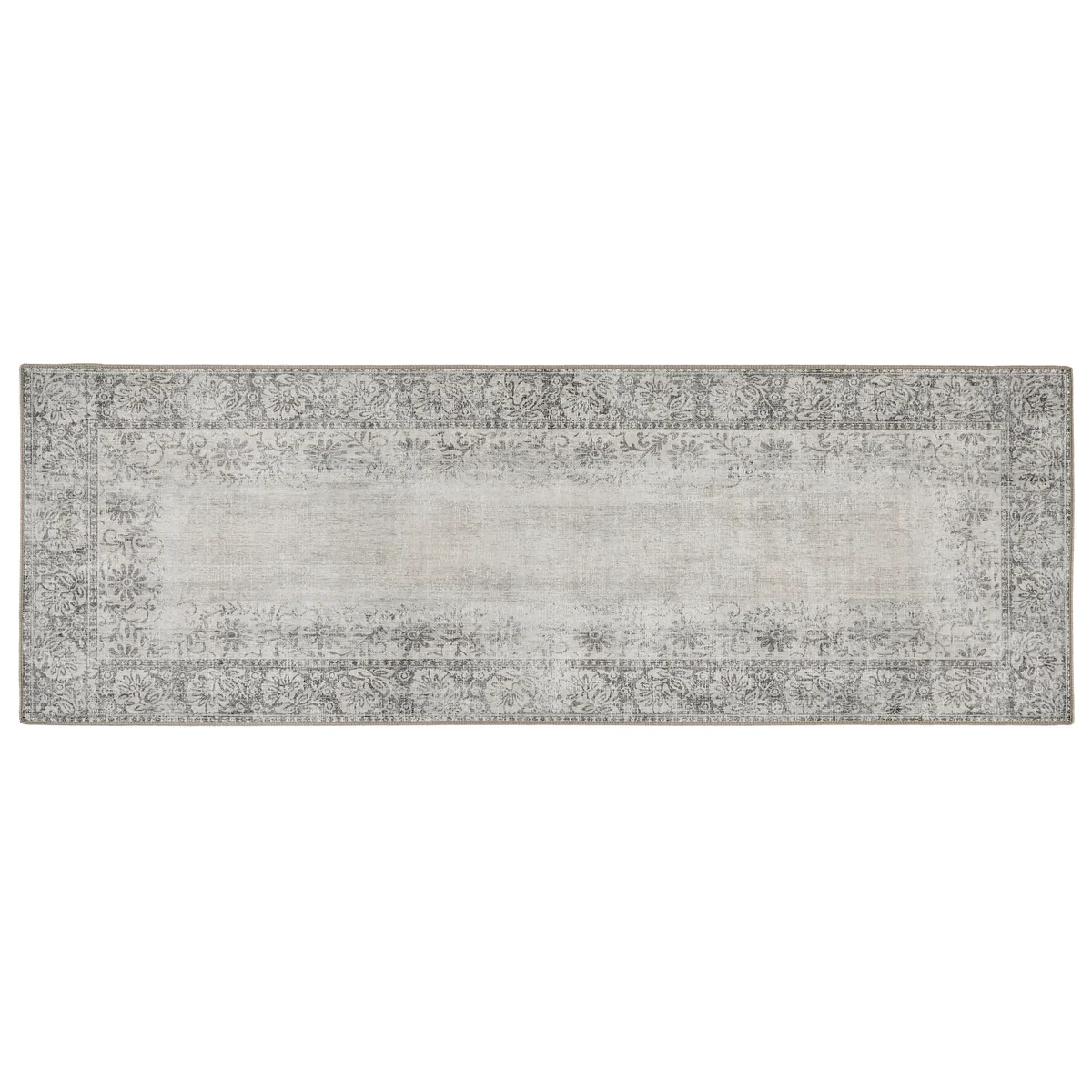 Un tapis vintage beige au design baroque revisité en format long couloir