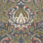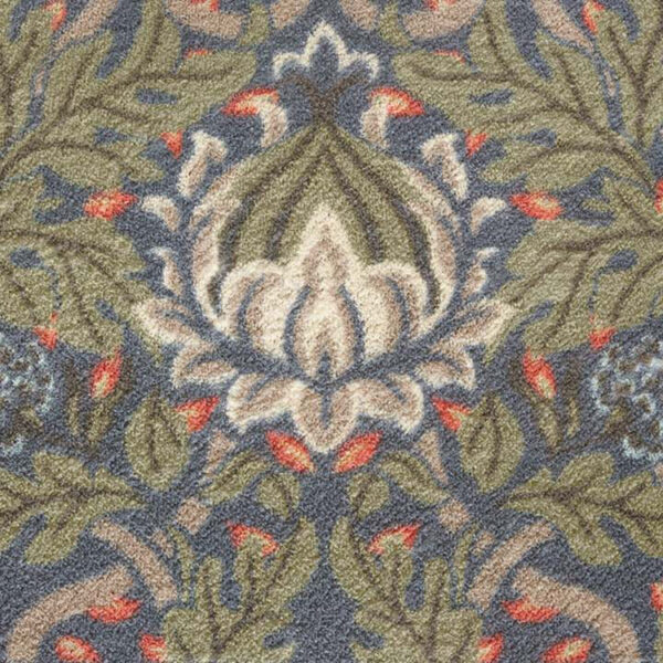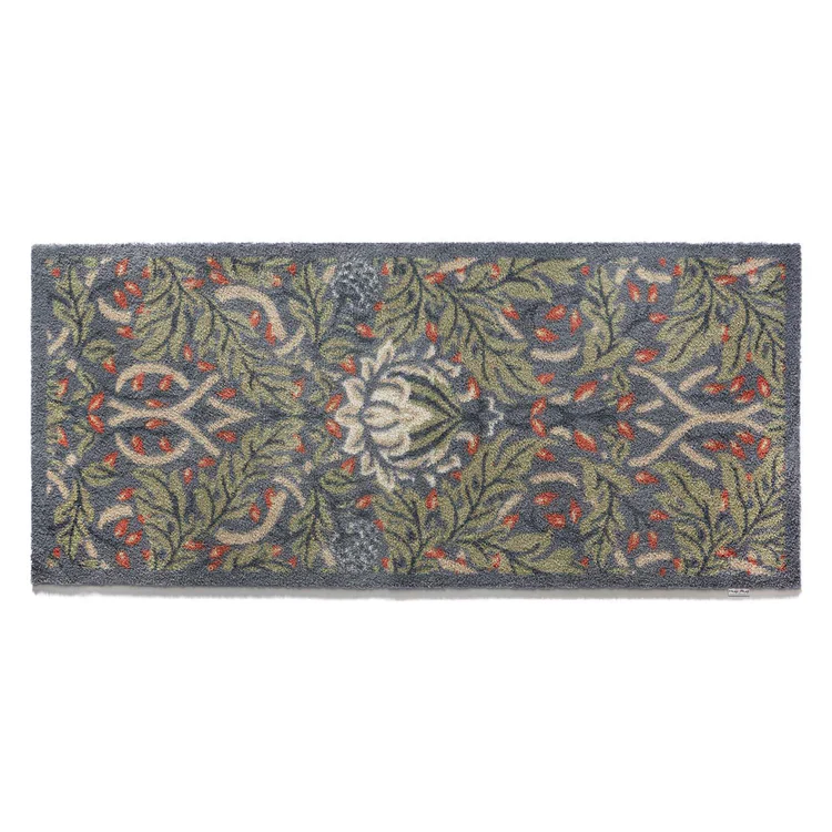Un tapis couloir raffiné au motif végétal inspiré de William Morris, où feuilles vert foncé et petites fleurs rouges, jaunes et bleues se déploient sur un fond bleu-gris apaisant. Une création délicate et intemporelle qui apporte élégance et sérénité à ton intérieur.