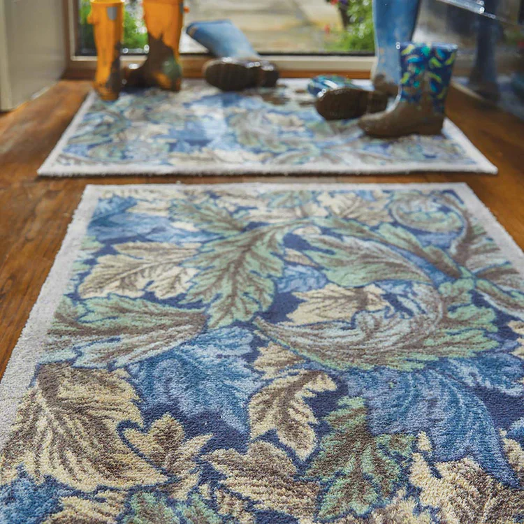 La bordure gris clair encadre le motif avec délicatesse, mettant en valeur la richesse du fond bleu foncé. Idéal dans un couloir, une entrée ou une véranda, il transforme les passages de la maison en véritables espaces décoratifs. Pour une harmonie parfaite, découvre aussi la version tapis d’entrée Fleurs Sauvages, ou explore nos tapis salle à manger et grands tapis salon assortis.
