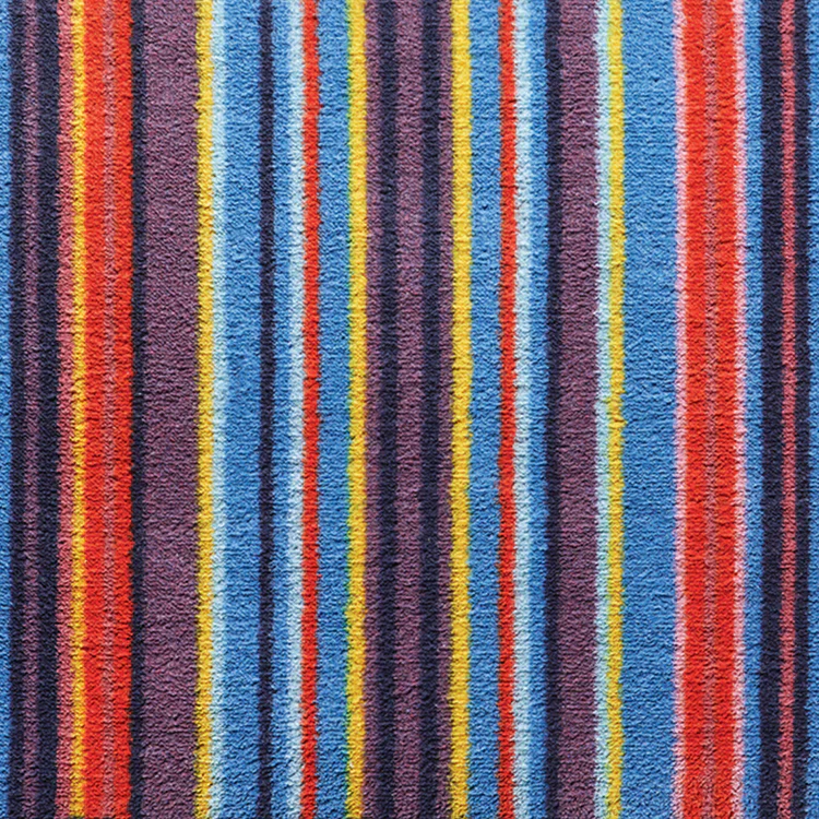 Ses rayures verticales multicolores structurent les passages et animent la circulation avec rythme et élégance. Encadré d’une bordure bleu marine, le motif gagne en profondeur et apporte une dynamique contemporaine aux couloirs.