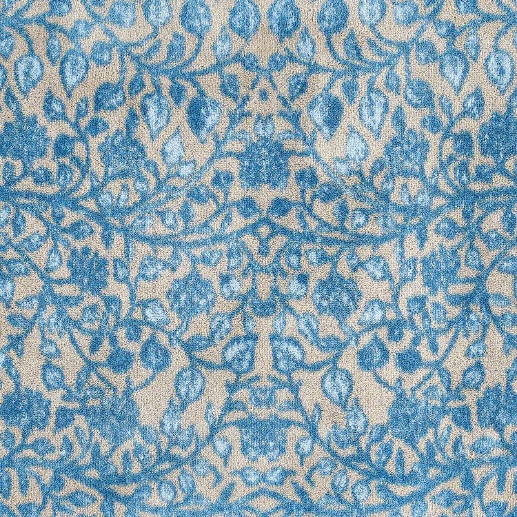 Les fleurs bleues, déclinées en plusieurs nuances, s’entrelacent harmonieusement dans un motif foisonnant et sophistiqué. Ce dessin ornemental, inspiré des grands classiques du design anglais, confère à ce tapis une aura intemporelle et une élégance subtile. Il s’intègre parfaitement dans une décoration classique, mais aussi dans un intérieur plus moderne en quête d’un accent artistique.