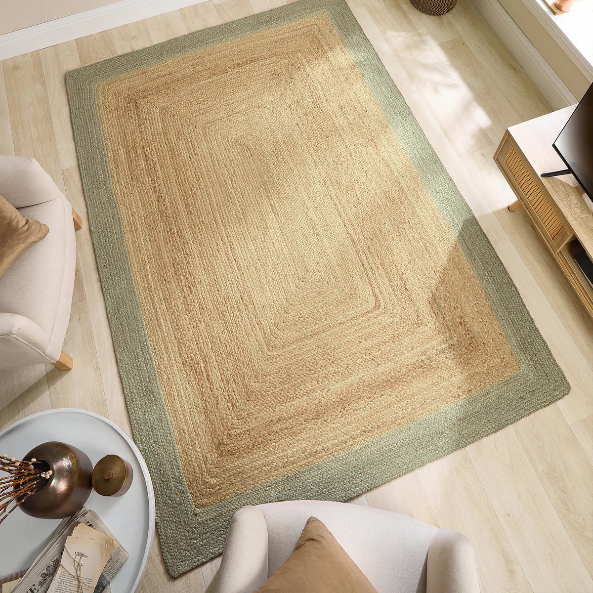 Tapis en jute bord vert pastel — tressage artisanal et fraîcheur naturelle
