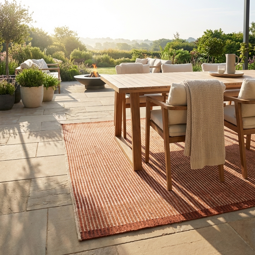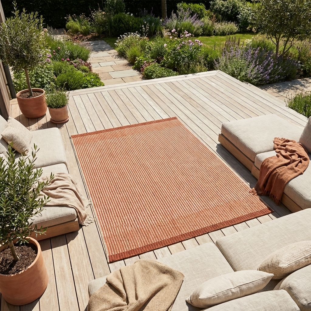 Tapis extérieur au motif rayures verticales dans des tons naturel beige et crème. Design simple et intemporel qui éclaire et structure vos espaces extérieurs avec sobriété.