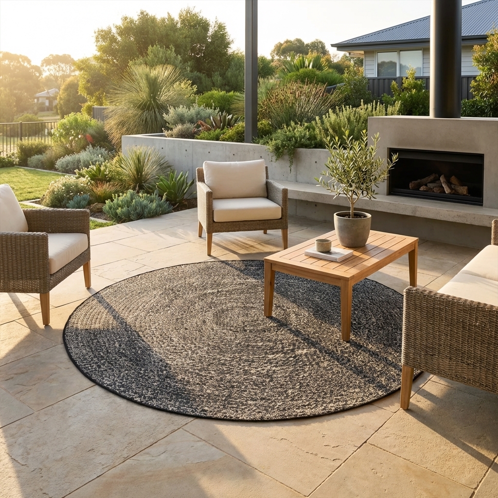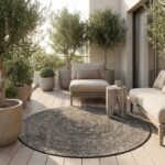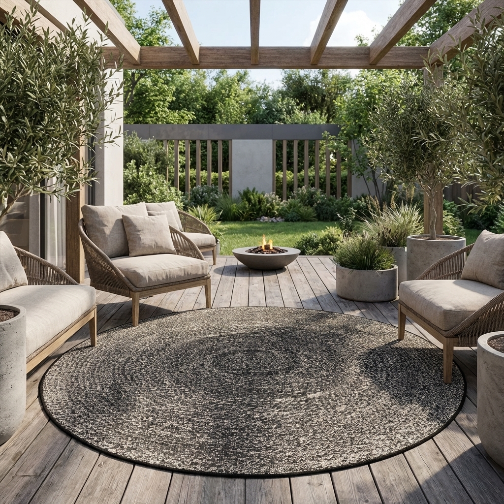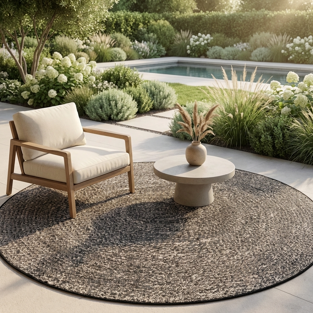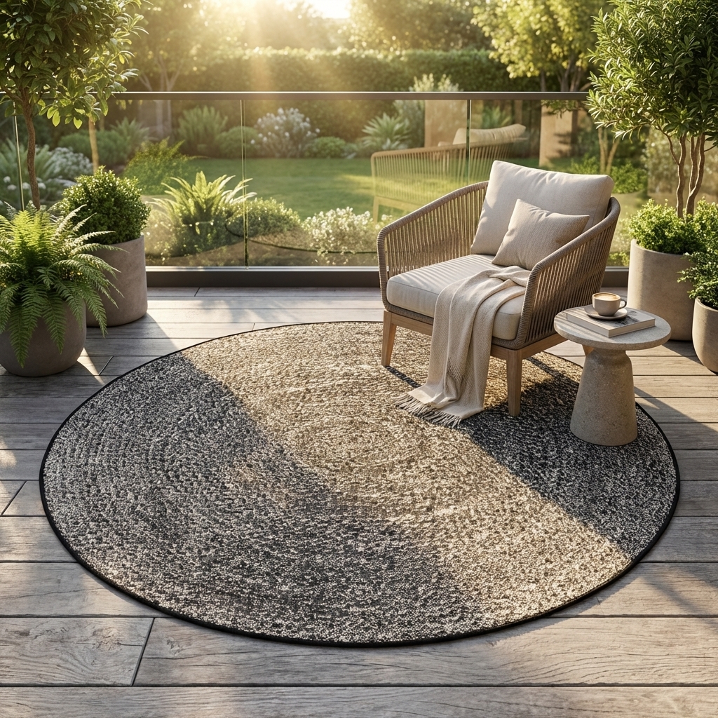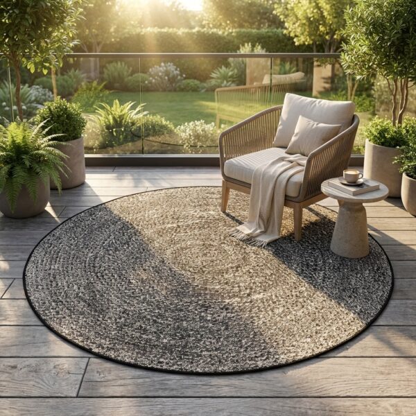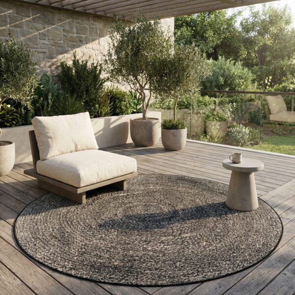Tapis rond extérieur Maliya – Gris chiné résistant pour terrasse et balcon