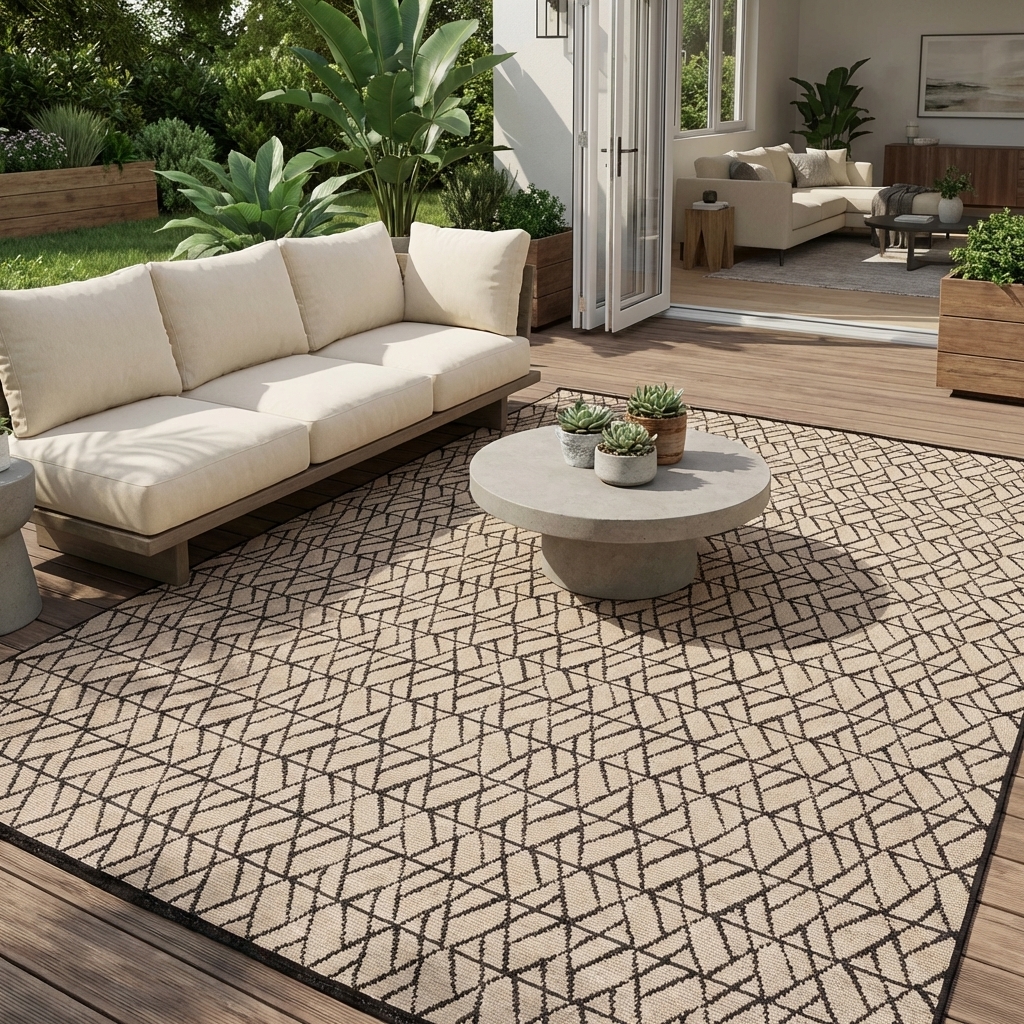 Apportez du style et du confort à votre extérieur avec le tapis Sadar. Son motif noir et beige, à la fois graphique et équilibré, s’intègre facilement dans tous les aménagements, du plus moderne au plus naturel.