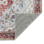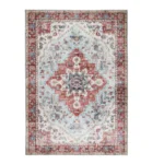 Dans la salle à manger, ce tapis salle à manger devient une pièce centrale. Son grand médaillon floral et sa bordure finement travaillée structurent l’espace repas avec élégance, tout en protégeant le sol des frottements de chaises. Ses tonalités terracotta et bleues insufflent une énergie conviviale, idéale pour des repas partagés dans un cadre harmonieux.