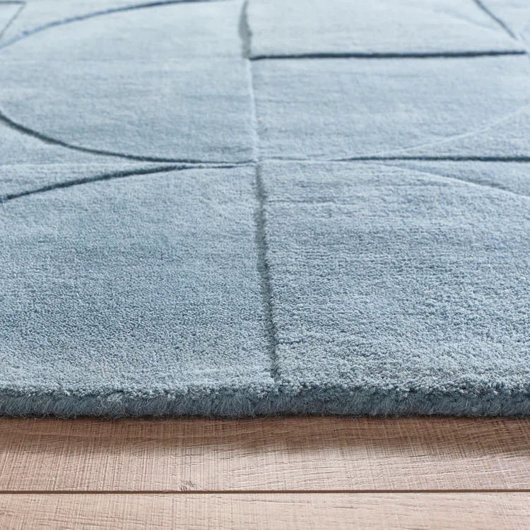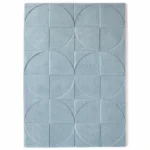 Tapis bleu clair à disques sculptés — pure laine tuftée main et design géométrique lumineux
