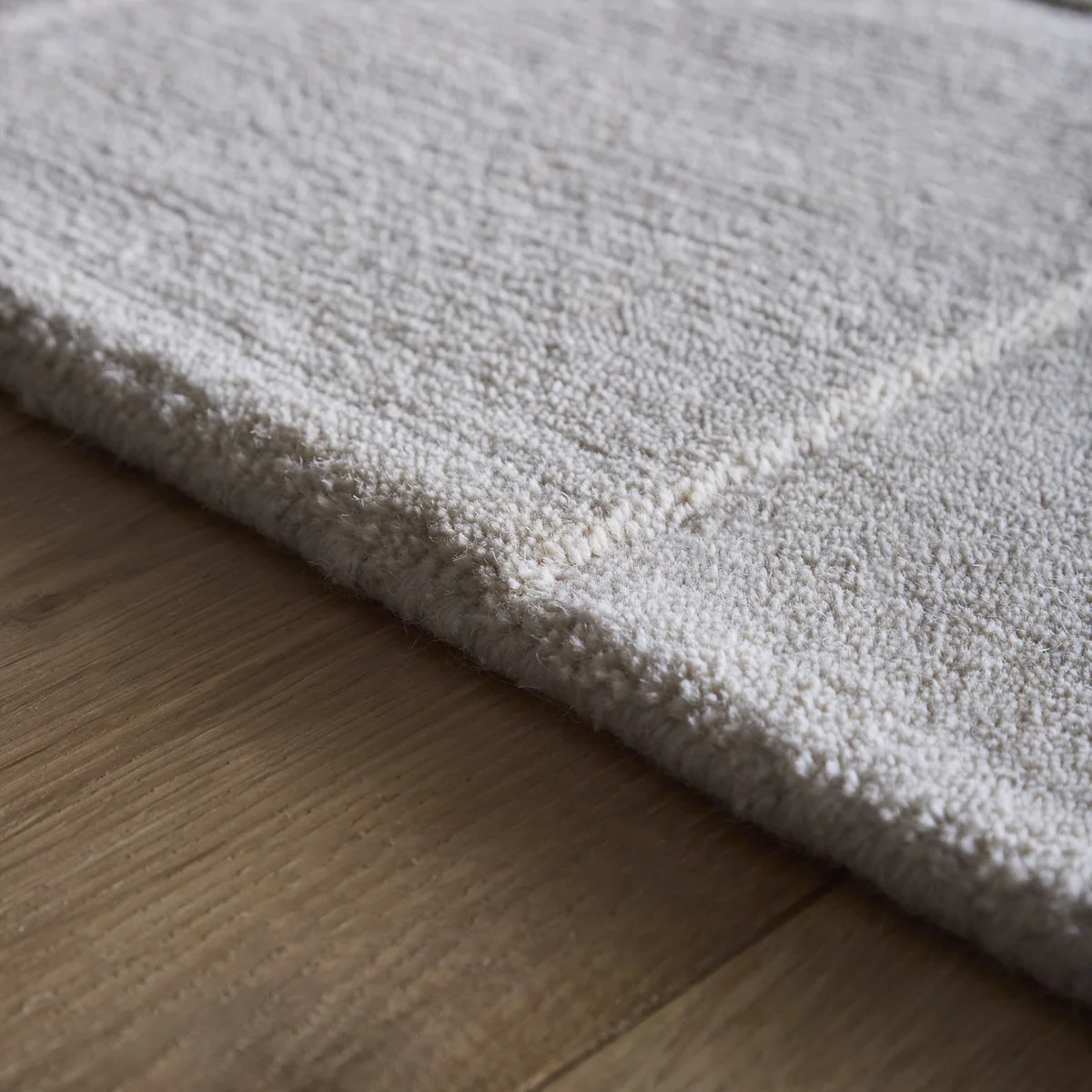 Tapis moderniste gris clair en pure laine sculptée. Design sobre à bordure ton sur ton, texture dense et velours épais, idéal comme grand tapis salon contemporain.