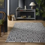 Le contraste du noir et de l’ivoire crée une composition visuelle à la fois forte et équilibrée. Ce tapis devient le centre de gravité du salon ou de la chambre, structurant l’espace avec justesse. Sa palette monochrome s’accorde aussi bien à un mobilier clair qu’à des matériaux bruts, dans l’esprit d’un intérieur contemporain.