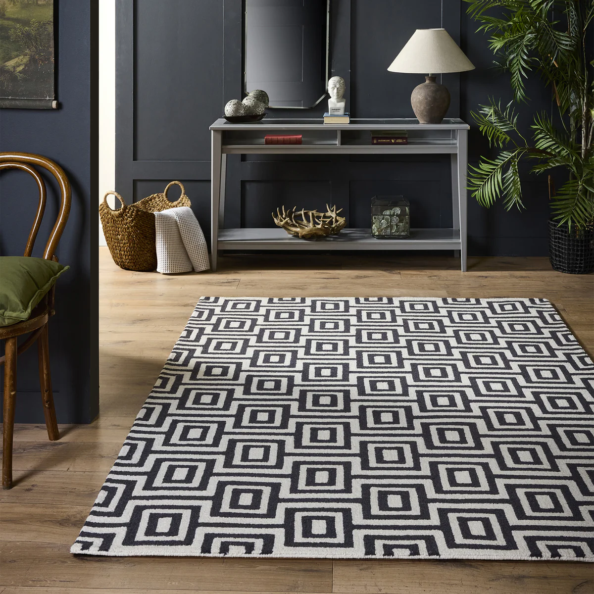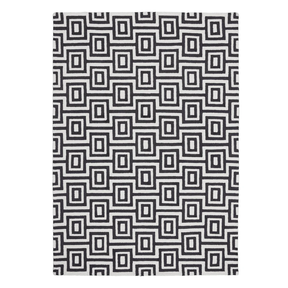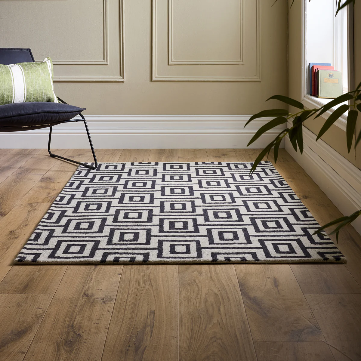 Tapis moderniste noir et ivoire à motif labyrinthe — pure laine tuftée main et contraste graphique