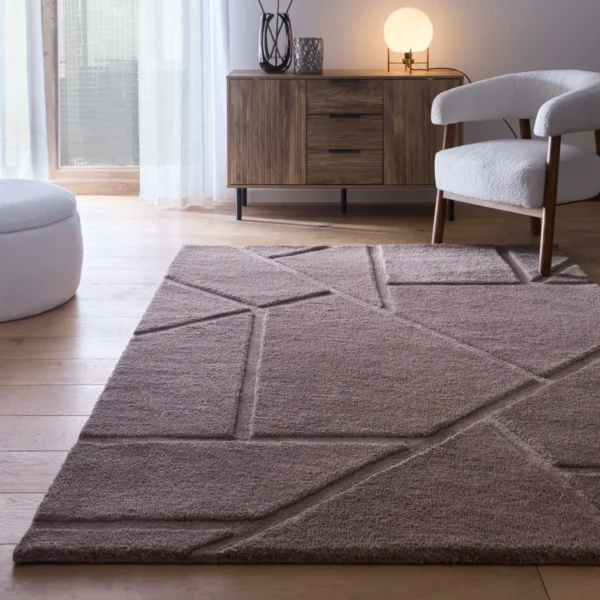Sa silhouette rectangulaire clarifie les zones d’assise et accompagne le mobilier sans le concurrencer. La palette marron-mauve crée un socle visuel rassurant et chaleureux, facile à associer aux neutres comme aux bois clairs.